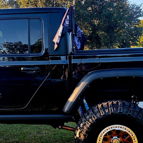 The 1/2″ antenna hole supports common setups like CB antennas, GMRS/FRS antennas, whip antennas, and even LED whips. It also plays nicely with flags: if you’re running a Foreverwave-style flag setup, you can position the flag just below the roofline so it still flies without getting punished by wind load as badly at highway speed.